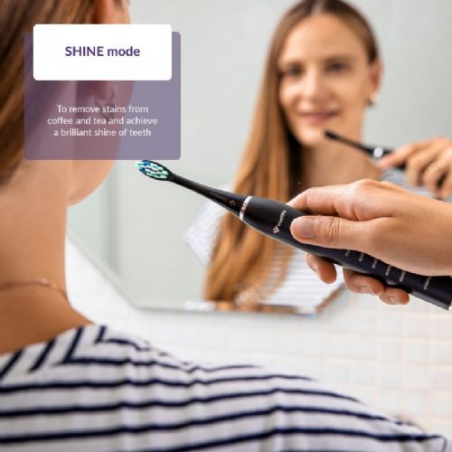 Naša zobna ščetka ima 5 načinov za zdrave in sijoče zobe. Clean za standardno čiščenje in odstranjevanje zobnih oblog, Shine za sijoč nasmeh in odstranjevanje madežev kave in čaja, Whiten za beljenje, Sensitive za občutljive zobe in dlesni ter način Massage za stimulacijo dlesni in izboljšanje njihovega zdravja.